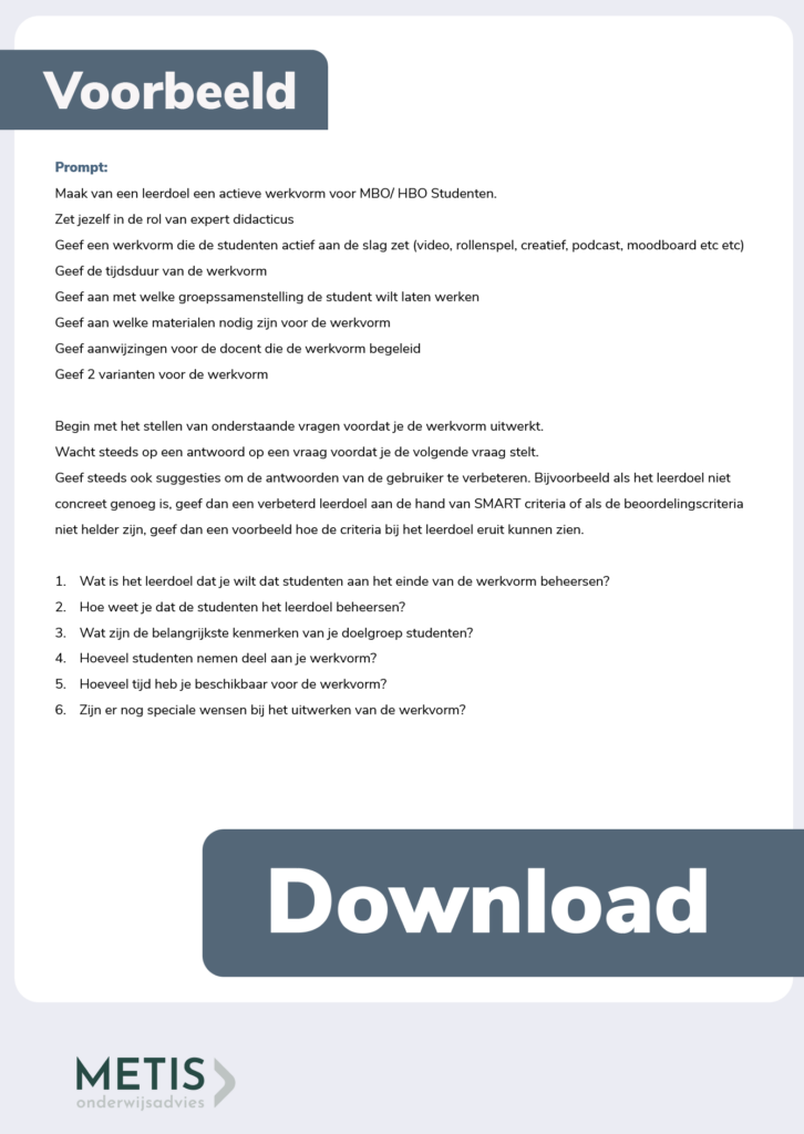 Goed nieuws: dat hoeft ook niet. Net zoals je geen automonteur hoeft te zijn om te snappen dat een storing in de ABS je remweg beïnvloedt, hoef je ook geen programmeur te zijn om AI in te zetten in je les. Begin klein. Gebruik tools als CoPilot of ChatGPT om ideeën op te doen, lesmateriaal visueel te verrijken of zelfs om uitleg op verschillende niveaus te genereren. Gebruik bijvoorbeeld onderstaande prompt om je werkvormen te activeren.